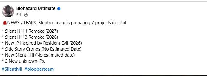 Jedan od najzvučnijih navoda dolazi od poznatog leakera poznatog kao Biohazard Ultimate, inače specijaliziranog za Resident Evil i horror naslove. On tvrdi da je u pripremi i Silent Hill 3 Remake, s planiranim izlaskom 2028. godine. Uz to, Bloober Team navodno razvija još jednu originalnu igru inspiriranu Resident Evilom, koja bi svjetlo dana trebala ugledati već 2026. godine. Ako su ove informacije točne, prvi teaser mogao bi se pojaviti već na The Game Awardsu 2025.