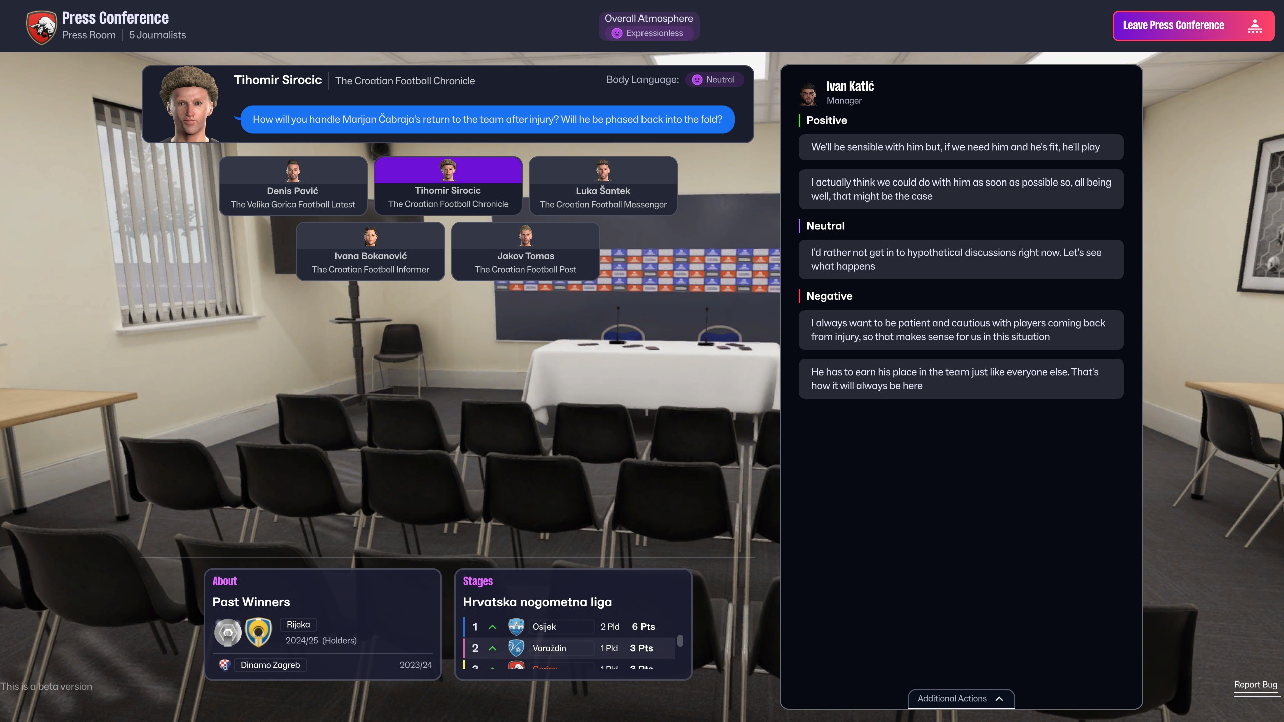 Uvijek sam bio zagovornik ideje da ovakve igre trebaju nuditi uglađenije i prirodnije iskustvo igranja: manje klikanja, više jasnih prikaza. No, FM26 kao da to uopće nije imao na umu. Objavite nekoliko oglasa za posao i čim stignu prijave, morate otvarati svakog trenera pojedinačno kako biste vidjeli njihove statistike. Za razliku od FM24, više ne postoji sažeti pregled koji bi vam olakšao usporedbu kandidata. Najgore od svega, statistike više nisu prikazane brojevima, već opisnim ocjenama. Teško je procijeniti tko je zapravo bolji kada umjesto jasnih vrijednosti imate oznake kao što su Average, Competent ili Reasonable. Sve stare pritužbe iz FM24 i dalje su prisutne: vrlo loš AI koji jednostavno ne zna posložiti momčadi, rotirati igrače i uglavnom zanemaruje mlade talente. Ništa od toga, čini se, nije ispravljeno.