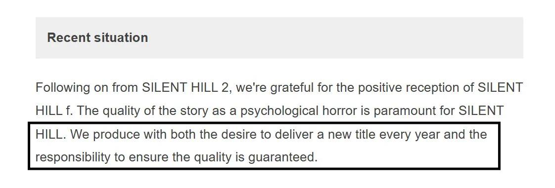 Nakon što je ovoga ljeta na tržište stigao Silent Hill f, koji je također naišao na solidan prijem, producent serijala Motoi Okamoto otkrio je u razgovoru za Famitsu da Konami cilja na ritam jednog naslova godišnje. Ipak, naglašava da kvantiteta neće ugroziti kvalitetu – cilj je da svaka igra donese svježu viziju i inovaciju, a ne da se ponavlja već viđeno.