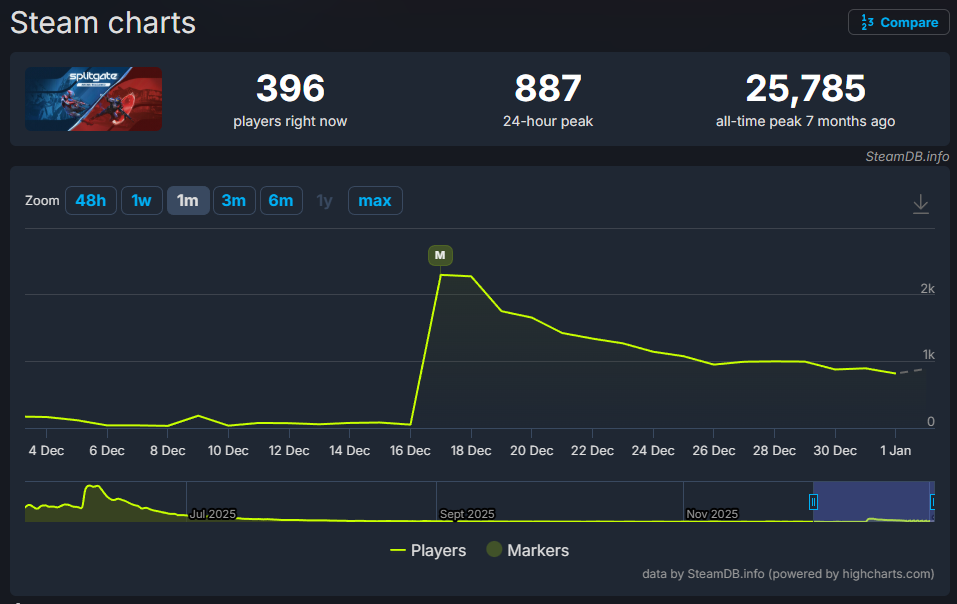 Slična je situacija i na Twitchu – dok je nekada Splitgate dosezao impresivnih 138.110 gledatelja, Splitgate: Arena Reloaded verzija jedva je okupila 134. Jasno je da interes publike gotovo ne postoji – ni za igranje, ni za gledanje.