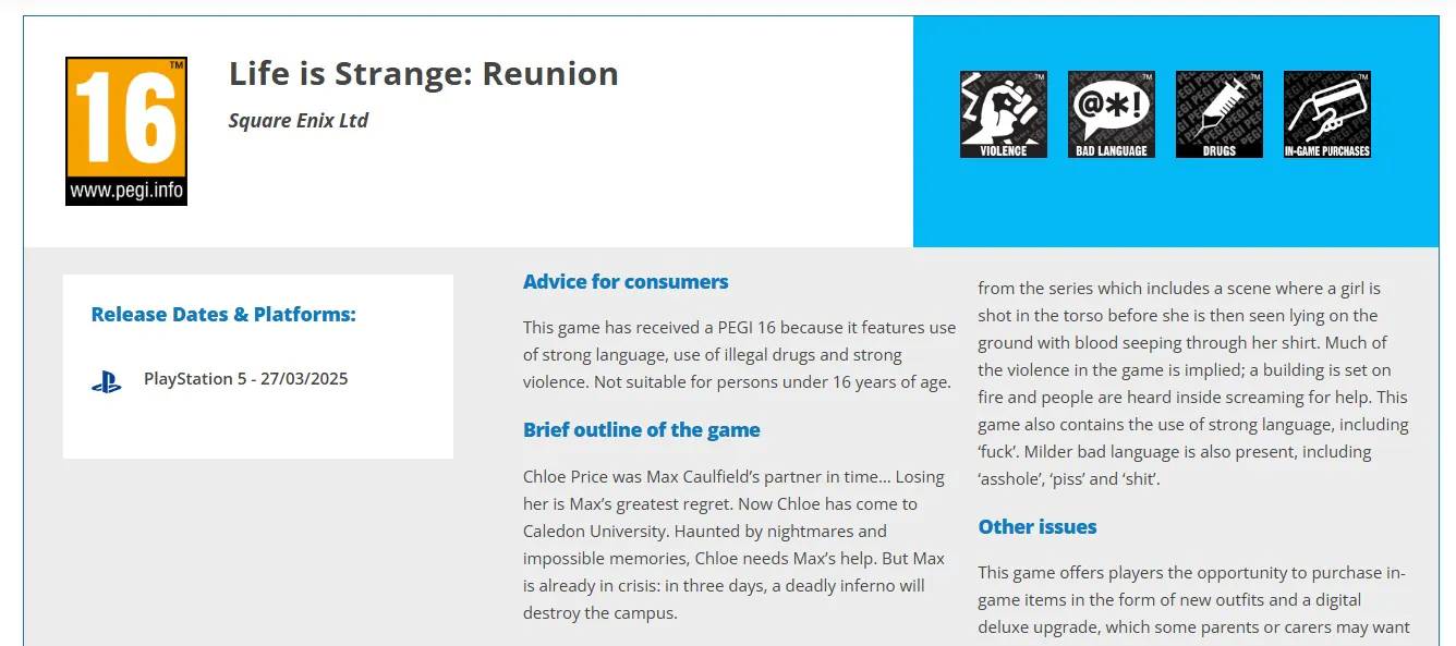 Prema podacima koji su nakratko osvanuli na službenoj stranici europske agencije za klasifikaciju igara PEGI, Life is Strange: Reunion je ocijenjen za dobnu skupinu 16+, zbog prisutnosti nasilja, korištenja droga i eksplicitnog jezika. Sama klasifikacija otkrila je i dio radnje, spominjujući Chloe Price i Max Caulfield, protagonistice originalne igre iz 2015. godine koje ponovno se susreću na Caledon Universityju, gdje ih čekaju noćne more, halucinacije i prijetnja smrtonosnog požara koji bi trebao uništiti kampus u samo tri dana.
