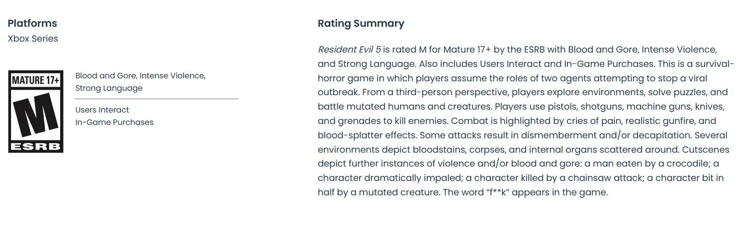 Nova ESRB ocjena (sustav za klasifikaciju igara prema dobi) za Resident Evil 5 pojavila se za Xbox Series X/S konzole, što sugerira da Capcom priprema verziju prilagođenu isključivo trenutnoj generaciji hardvera. Ono što je posebno podiglo prašinu u industriji je spominjanje “in-game purchase” stavke, što često ukazuje na modernije sustave monetizacije ili dodatni sadržaj, tipičan za velike, visokobudžetne remakeove, a rjeđi za obične remastere.
