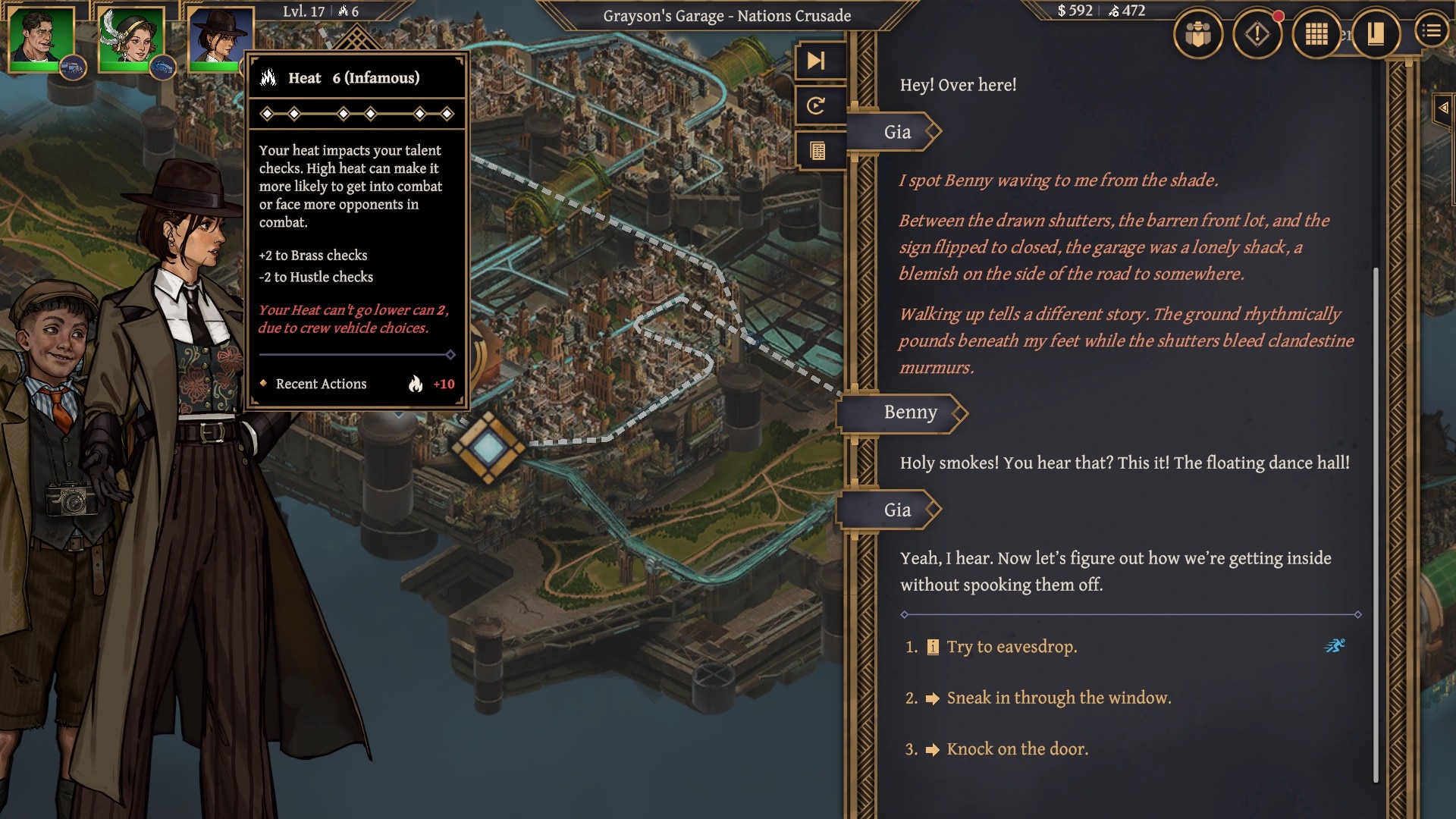 To je najizraženije u odnosu s Nellie. Ona je očito zamišljena kao emocionalno središte igre, idealistična protuteža Giinom cinizmu, no scenarij vam rijetko dopušta da joj se doista suprotstavite. Drugim riječima, Aether & Iron vam konstantno nudi privid izbora, samo da bi vas na kraju ipak usmjerio prema Nellienim odlukama. Tako nastaje neobičan nesklad – svijet se predstavlja kao surov i nemilosrdan, a istovremeno se stalno prilagođava njezinoj nepromišljenosti. Ono što je trebalo biti zanimljiva dinamika između jedne mrzovoljne realistkinje i druge optimistice pretvara se u test strpljenja, osobito kada igra inzistira da podržite odluke u kojima zapravo niste imali stvarni utjecaj.