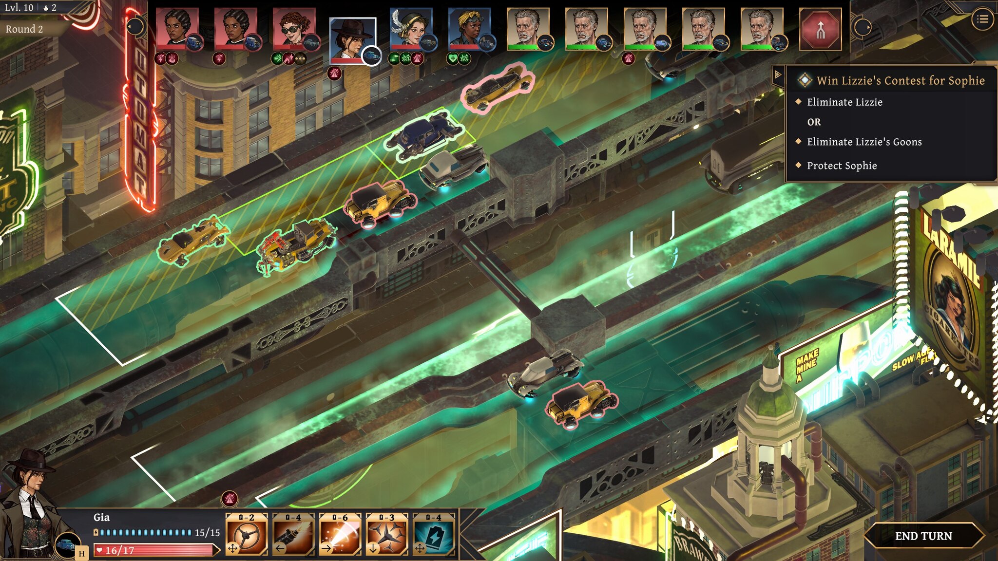 S druge strane, borba je područje u kojem se Aether & Iron uistinu izdvaja. Umjesto klasičnih sukoba, okršaji su oblikovani kao potezne automobilske potjere po brzim autocestama. Pozicioniranje, momentum, prijetnje iz okoline i upravljanje resursima stapaju se u sustav koji djeluje unikatno u žanru koji često igra na sigurno. Osjeća se prava napetost dok upravljate likovima, jer nikada točno ne znate što se sljedeće može pronaći na repertoaru.
